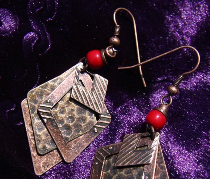 模様が刻まれたダイヤ型のプレートとビーズのピアスです。