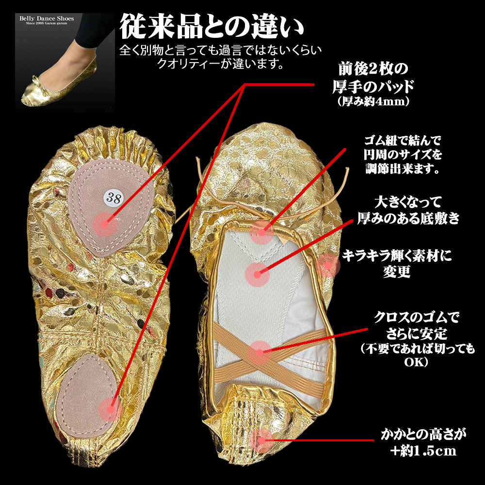 ベリーダンスは裸足で踊るものと思われがちですすが、足をつかった動きも大変多く、特にターンなどをする際は裸足ですと、床がこすれてうまく回れなかったり、痛くなってしまったりという事が多数あります。練習用で使う際は特に決まりはなく、バレエシューズでも良いのですが、もし、本番でも使う予定ならば、練習の時から同じシューズで慣れておいたほうがいいと思います。こちらのタイプは適度なクッション素材のヒールがついたタイプで、 履き心地は抜群で快適です。長時間のレッスンやWS、ショーなどの場で踊る時にも足に負担がかかりづらく、なおかつ、美しい存在感のある足元になるので一つあると大変重宝して頂けるお品です。